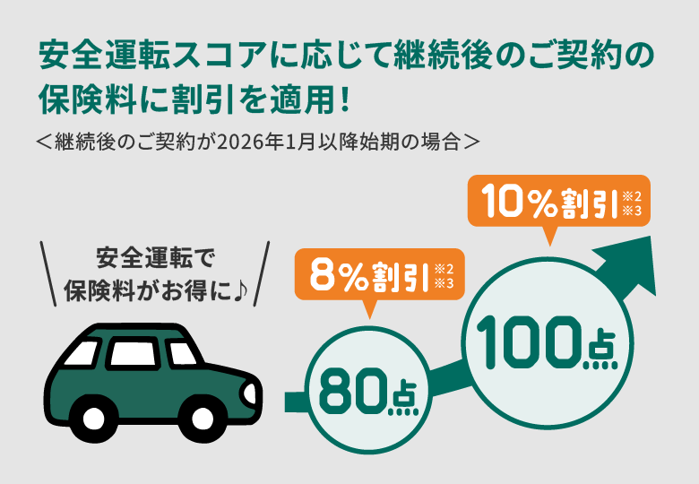 ※3 安全運転スコアの区分がCの場合と比較した割引率です。割引率は2026年1月以降始期の内容であり、将来変更となる場合があります。なお、2025年12月以前始期のご契約の場合、8%(「タフ・つながるクルマの保険」、「タフビズ事業用自動車総合保険(つながるプラン)」の場合は5%)の運転特性割引を適用します。また、一部の特約には割引が適用されないため、保険料全体に対する割引率とは一致しません。詳細は各商品パンフレットをご参照ください。