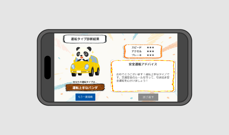簡単なゲームを通じて、あなたの運転タイプを診断。タイプに応じた運転アドバイスを確認することで、安全運転のポイントが理解できます。