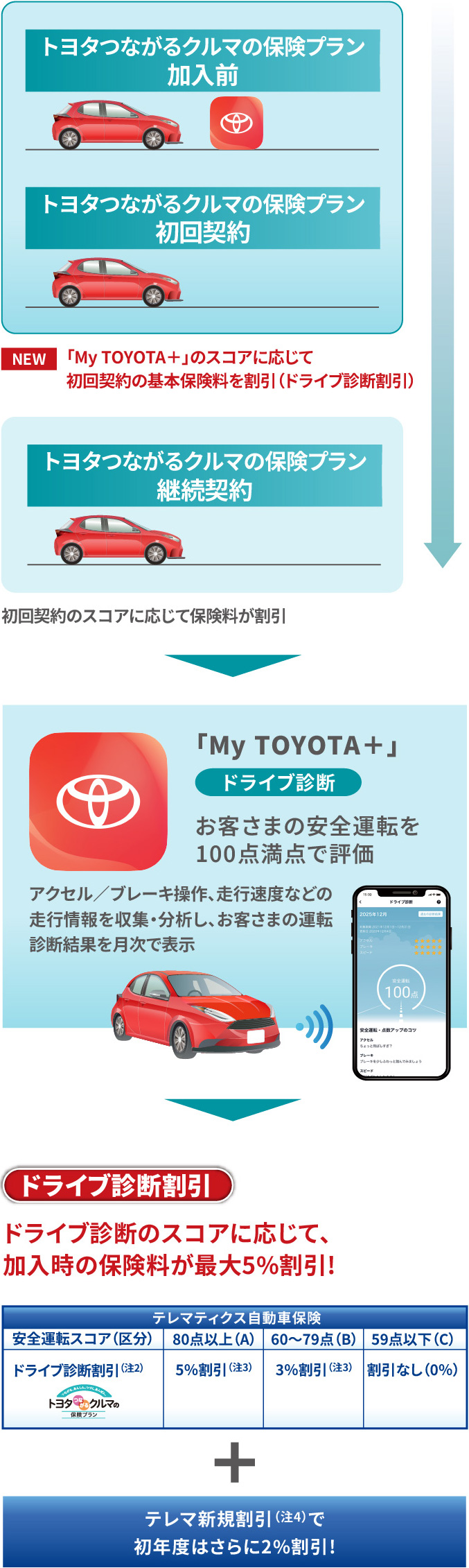 - 継続後のご契約の基本保険料には、前契約のご契約のお車における運転特性計測期間中の運転特性(安全運転スコア)に応じて割引を適用します。
