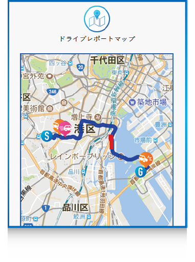 1回の運転ごとのドライブルートを表示します。速度超過・急アクセル・急ブレーキのあった地点が表示されるので、客観的に運転を振り返ることができます。※非表示とすることもできます。