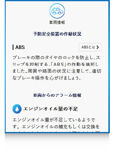 ABS(アンチロック・ブレーキシステム)等の予防安全装置の作動状況や燃費情報、タイヤ空気圧の低下・電子キーの電池残量等のアラーム情報を表示します。※車種によりご提供できる情報が異なります。