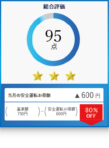 1か月分の車両運行情報を集積したスコアを100点満点で表示し、該当月の保険料を表示します。安全運転スコアに基づく運転分保険料の割引率・割引額(安全運転お得額)も表示されます。