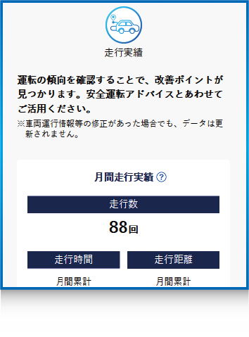 - 「マンスリーレポート」は1か月間の車両運行情報の累計です(例:4/10保険始期契約で8月走行分レポートは8/10~9/9までの車両運行情報の累計)。