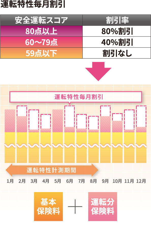 - 「運転特性毎月割引」は、ご契約のおクルマの毎月の走行における「速度超過・急アクセル・急ブレーキ」の発生頻度(運転特性)を評価して、割引率を決定します(運転分保険料にのみ適用します)。