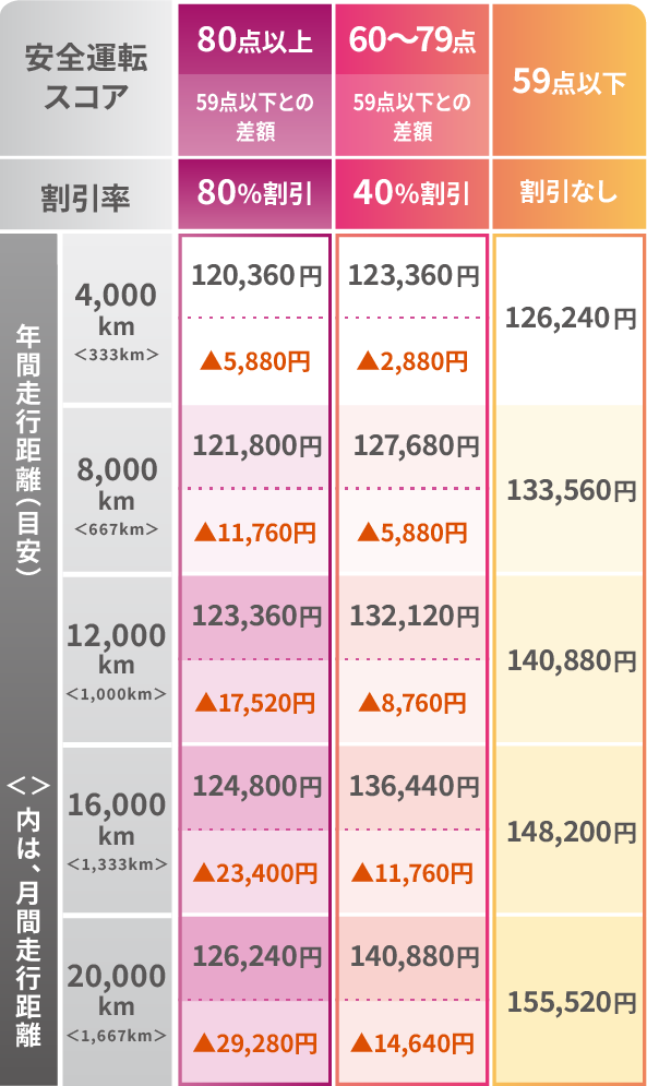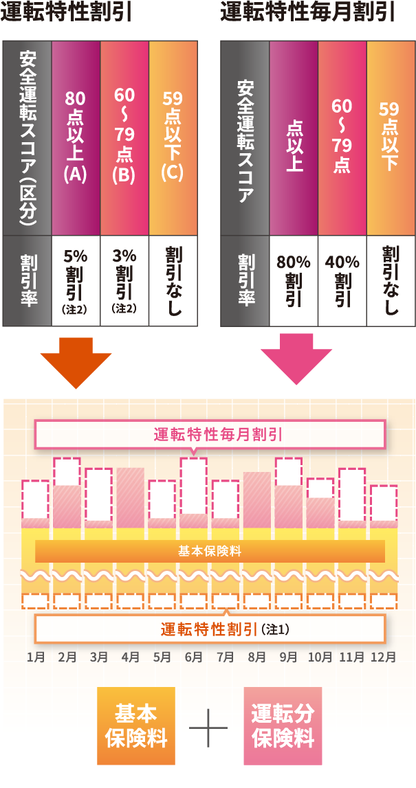 - 運転分保険料は、走行距離と運転特性(安全運転スコア)に応じて保険料が決まります。