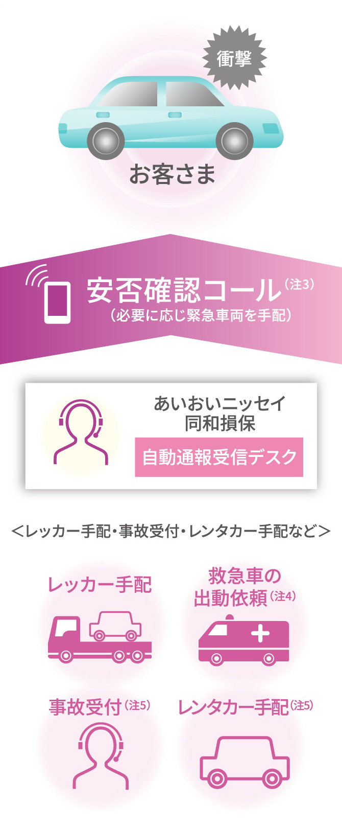 - (注2)事故以外による衝撃を検知した場合にも自動通報受信デスクに通知され、安否確認コールがされることがあります。