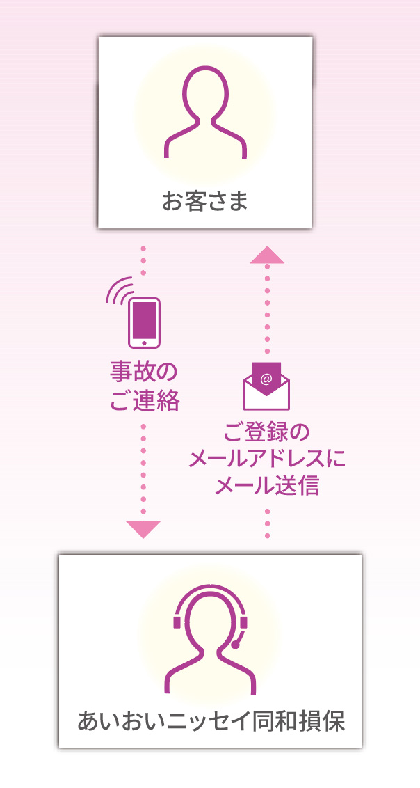 メールに記載された緊急時連絡先にお客さまよりご連絡いただくことで、緊急のレッカー手配や救急車の出動依頼・事故の受付・レンタカー手配等を行います。