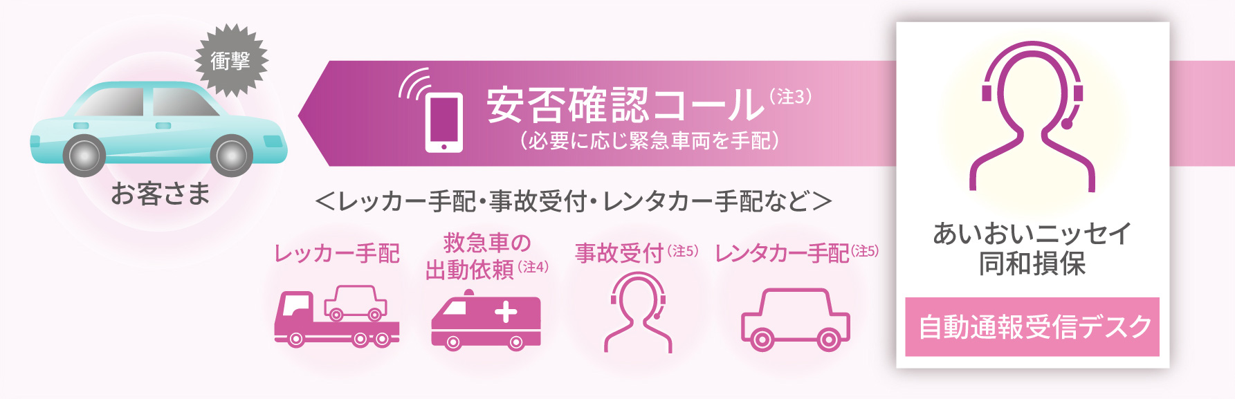 - (注5)事故受付・レンタカー手配は、自動通報受信デスクから専用事故受付デスクに連携され、専任オペレータが対応します。